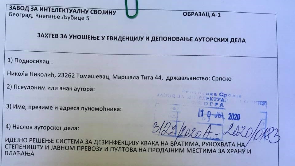 Predmet ove prijave je proizvod koji se montira na kvake na vratima, rukohvatima na stepeništu i javnom prevozu, odnosno ispred i iza pultova za prodaju hrane i vršenja placanja u cilju dezinfekcije i sprecavanja širenja virusa i bacila koji se zadržavaju i tako prenose sa coveka na coveka (transmisija).