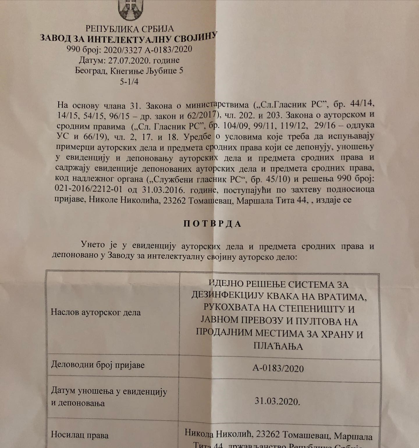 IDEJNO REŠENJE SISTEMA ZA DEZINFEKCIJU KVAKA NA VRATIMA, RUKOHVATA NA STEPENIŠTU I JAVNOM PREVOZU I PULTOVA ZA HRANU I PLACANJA